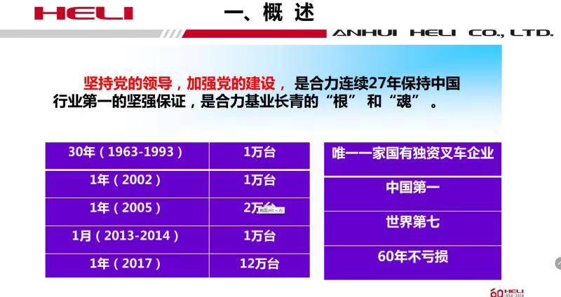 現場交流活動部分,合力系統地、多維度地向與會代表分享了集團發展的戰略思考和實踐做法。合力黨委書記、董事長張德進介紹了公司60年的發展歷程。合力是安徽省國資委獨資企業,主營業務為工業車輛、工程機械及關鍵零部件的研發、制造與銷售,是我國規模最大,產業鏈條最完整,綜合實力與經濟效益最好的工業車輛研發、制造和銷售基地。世界工程車輛協會主席單位。經過60年的發展,合力產品目前在線生產的2000多種型號、500多類全部擁有自主知識產權,產品綜合性能處于國內領先、國際先進水平。主導產品通過歐盟、美國和ISO體系等相關認證。