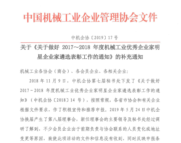 關于做好2017~2018年度機械工業優秀企業家明星企業家遴選表彰工作的補充通知--中機企協[2019]17號.pdf