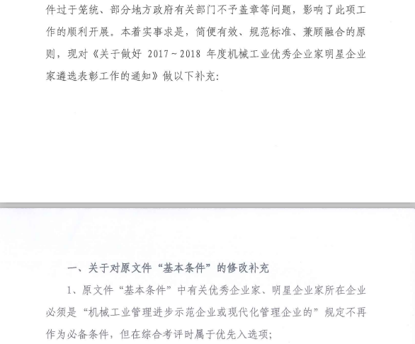 關于做好2017~2018年度機械工業優秀企業家明星企業家遴選表彰工作的補充通知