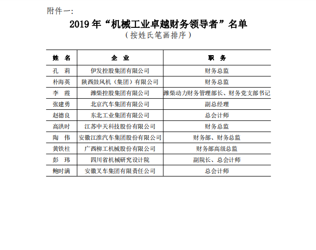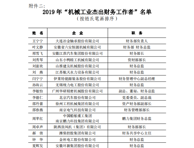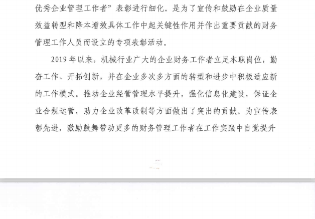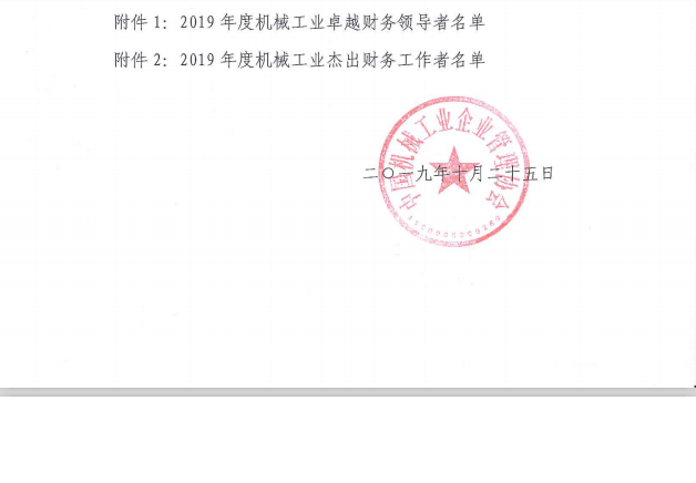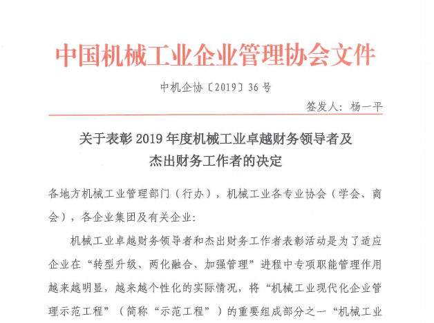 關于表彰2019年度機械工業卓越財務領導者及杰出財務工作者的決定