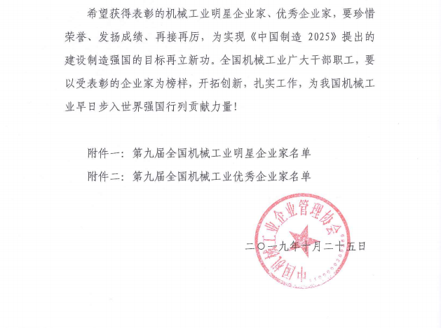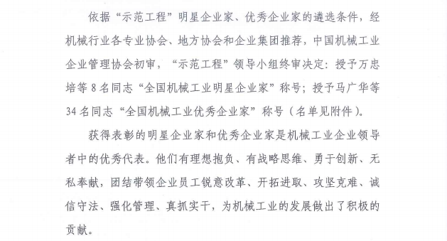關(guān)于表彰第九屆全國機(jī)械工業(yè)明星企業(yè)家、優(yōu)秀企業(yè)家的決定