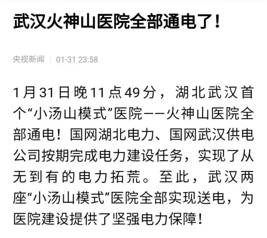 眾人拾柴,點亮火神山。1月31日晚11點49分,湖北武漢首個“小湯山模式”醫院——火神山醫院全部通電。